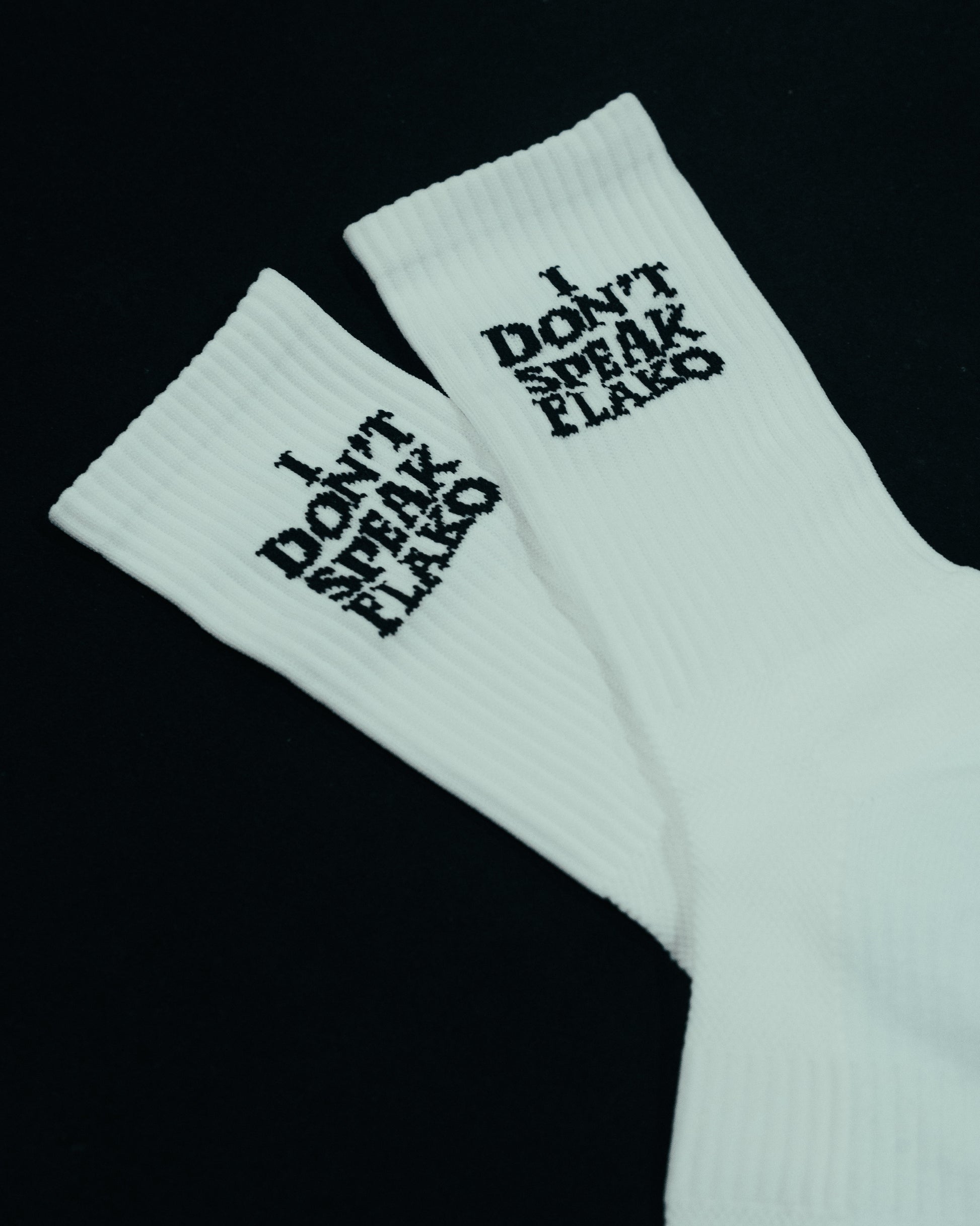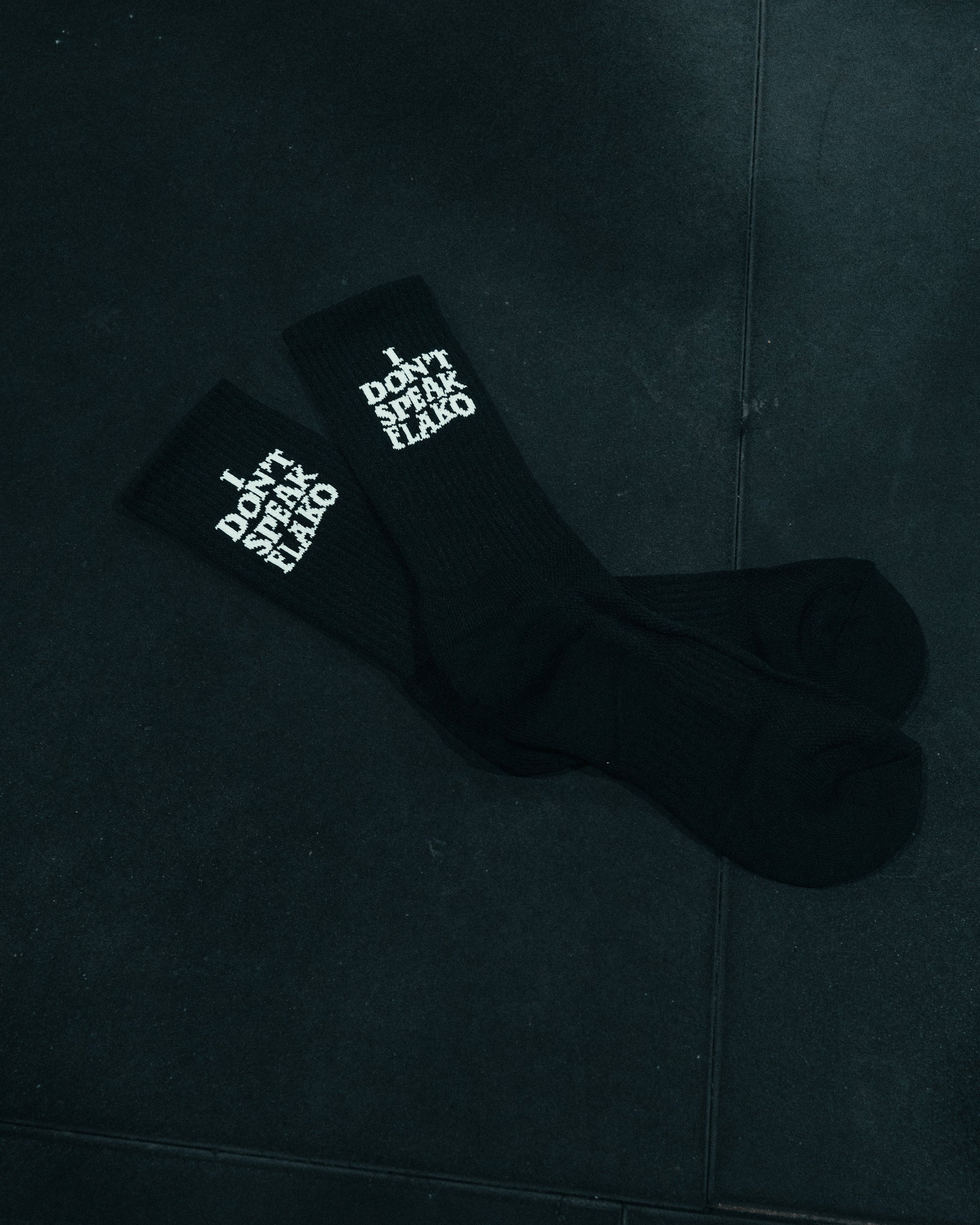 Lleva los mejores Gains a cualquier parte con los calcetines de I DON’T SPEAK FLAKO. Disponibles en color blanco y negro.